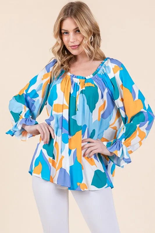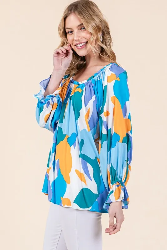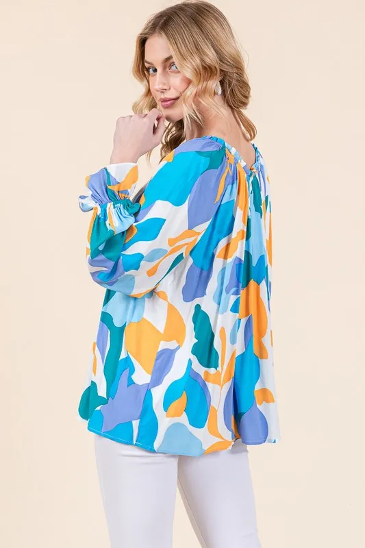 Abstract Print Off-the-shoulder Long Sleeve Top – Blue Multi