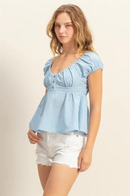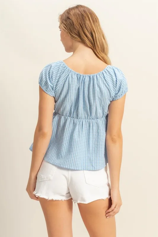 Gingham Scoop Neck Cap Sleeve Blouse – Blue