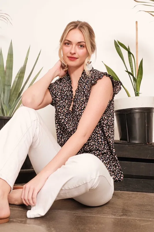 Multi Dot Print Sleeveless Button Down Blouse – Black