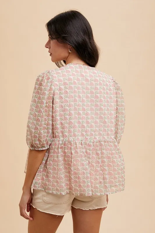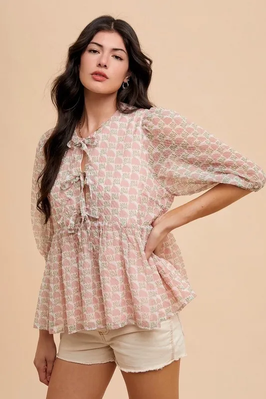 Printed Front Tie Closure Babydoll Blouse – Pink