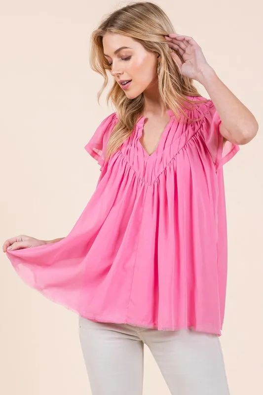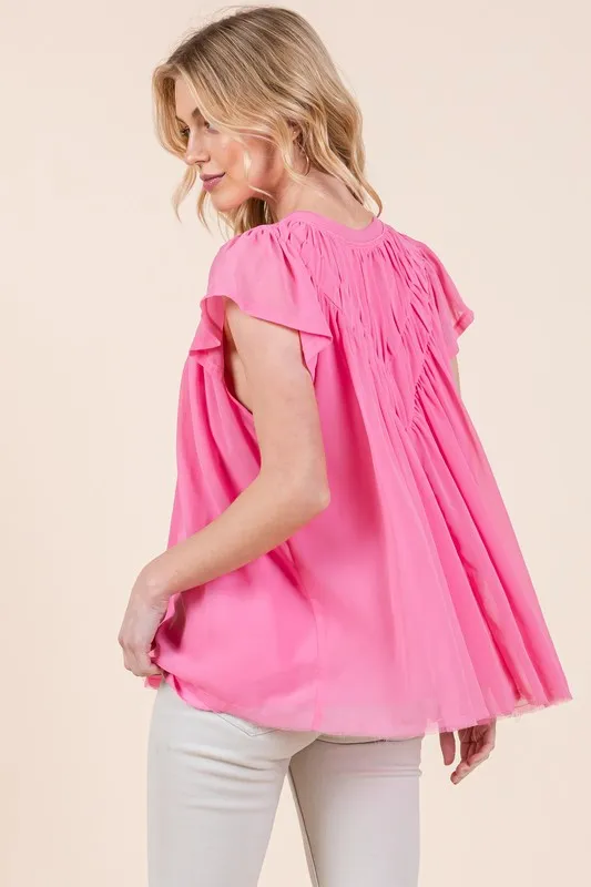 Solid Shirred Flutter Sleeve Chiffon Blouse – Pink
